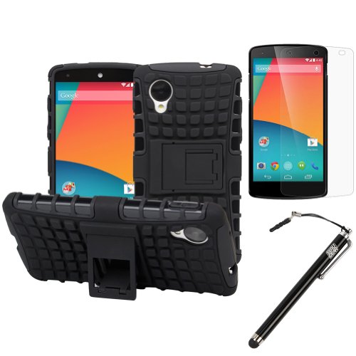 Evecase Noir Coque Arrière en TPU et Plastique Caoutchoutée Très Forte pour LG Google Nexus 5 Smartphone avec Support + FILM PROTECTION ECRAN + Stylet.